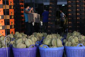 (250514) -- CHANTHABURI, 14 mayo, 2025 (Xinhua) -- Imagen del 13 de mayo de 2025 de trabajadores descargando durianes en...