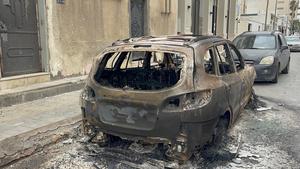 (250514) -- TRIPOLI, 14 mayo, 2025 (Xinhua) -- Imagen del 14 de mayo de 2025 de un automóvil dañado durante...