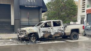 (250514) -- TRIPOLI, 14 mayo, 2025 (Xinhua) -- Imagen del 14 de mayo de 2025 de vehículos dañados durante enfrentamientos...