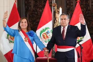 (250514) -- LIMA, 14 mayo, 2025 (Xinhua) -- Imagen del 6 de marzo de 2024 de la presidenta peruana, Dina Boluarte (i), y el entonces presidente del Consejo de Ministros de Perú, Gustavo Adrianzén (d), saludando luego de jurar como ministro, en el Palacio de Gobierno, en Lima, Perú. Adrianzén presentó el martes su renuncia al cargo ante la mandataria del país, Dina Boluarte, horas antes de que el Congreso debatiera al menos cuatro mociones para destituirlo. (Xinhua/Mariana Bazo) (mb) (ah) (ra) (ce)