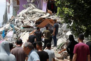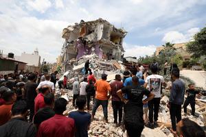 (250515) -- TAMMUN, 15 mayo, 2025 (Xinhua) -- Palestinos inspeccionan los escombros de un edificio demolido tras una operación israelí,...