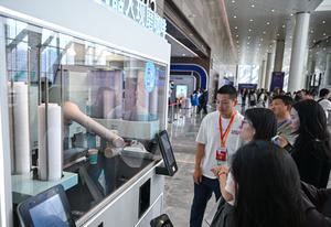 (250516) -- WUHAN, 16 mayo, 2025 (Xinhua) -- Visitantes compran café servido por un robot en la 20 Exposición Internacional...