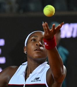 (250516) -- ROMA, 16 mayo, 2025 (Xinhua) -- Imagen del 15 de mayo de 2025 de Coco Gauff sirviendo la...