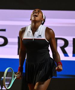 (250516) -- ROMA, 16 mayo, 2025 (Xinhua) -- Imagen del 15 de mayo de 2025 de Coco Gauff festejando después...