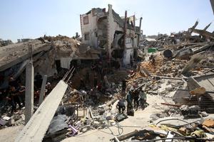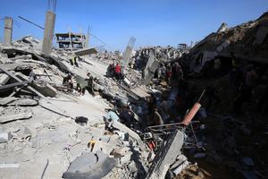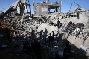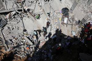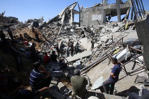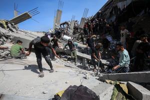 (250516) -- GAZA, 16 mayo, 2025 (Xinhua) -- Palestinos inspeccionan edificios destruidos tras un ataque aéreo israelí en el campamento...