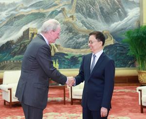 (250516) -- BEIJING, 16 mayo, 2025 (Xinhua) -- El vicepresidente chino, Han Zheng, se reúne con Richard Wagoner, presidente de...
