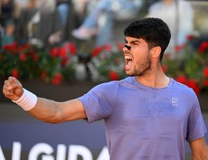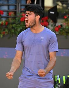 (250517) -- ROMA, 17 mayo, 2025 (Xinhua) -- Imagen del 16 de mayo de 2025 de Carlos Alcaraz festejando después...