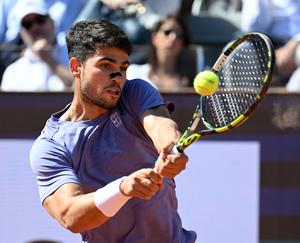 (250517) -- ROMA, 17 mayo, 2025 (Xinhua) -- Imagen del 16 de mayo de 2025 de Carlos Alcaraz devolviendo la...