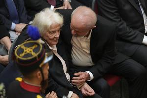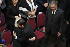 (250515) -- MONTEVIDEO, 15 mayo, 2025 (Xinhua) -- El presidente chileno, Gabriel Boric (c), abraza a la viuda del expresidente...