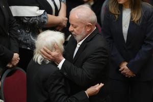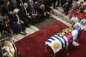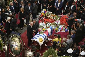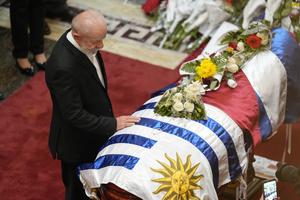 (250515) -- MONTEVIDEO, 15 mayo, 2025 (Xinhua) -- El presidente brasileño, Luiz Inácio Lula da Silva, toca el féretro durante...