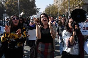 (250515) -- SANTIAGO, 15 mayo, 2025 (Xinhua) -- Manifestantes gritan consignas en una marcha durante un paro nacional de docentes...