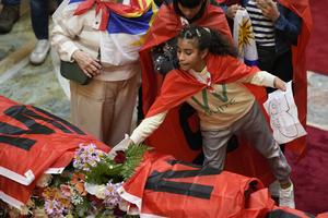 (250515) -- MONTEVIDEO, 15 mayo, 2025 (Xinhua) -- Una niña deposita una flor sobre el féretro durante la segunda jornada...