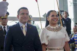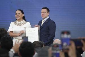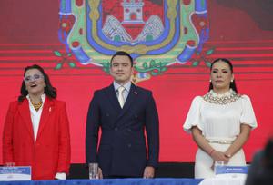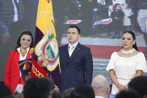 (250515) -- QUITO, 15 mayo, 2025 (Xinhua) -- El presidente ecuatoriano, Daniel Noboa (c), la vicepresidenta ecuatoriana, María José Pinto...