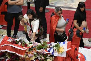(250515) -- MONTEVIDEO, 15 mayo, 2025 (Xinhua) -- Una mujer deposita una flor sobre el féretro durante la segunda jornada...