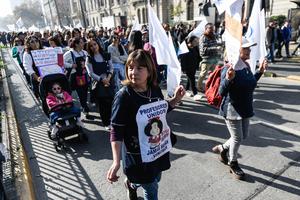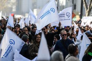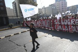 (250515) -- SANTIAGO, 15 mayo, 2025 (Xinhua) -- Manifestantes participan en una marcha durante un paro nacional de docentes convocado por...