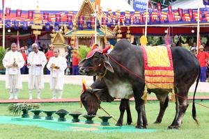 (250515) -- KAMPONG CHHNANG, 15 mayo, 2025 (Xinhua) -- Bueyes reales son alimentados con forraje durante una ceremonia real de...