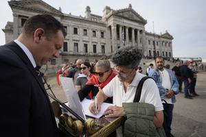 (250515) -- MONTEVIDEO, 15 mayo, 2025 (Xinhua) -- Una mujer escribe en el libro de condolencias durante la segunda jornada...