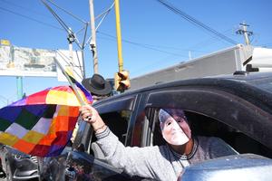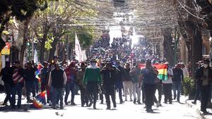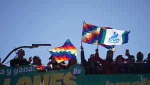 (250516) -- LA PAZ, 16 mayo, 2025 (Xinhua) -- Simpatizantes del expresidente boliviano Evo Morales, ondean banderas durante una marcha...