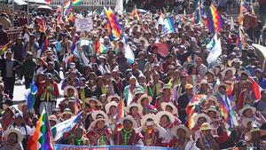 (250516) -- LA PAZ, 16 mayo, 2025 (Xinhua) -- Indígenas participan en una marcha en apoyo al expresidente boliviano Evo...