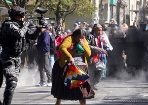 (250516) -- LA PAZ, 16 mayo, 2025 (Xinhua) -- Elementos de la policía lanzan gas a indígenas para evitar que...