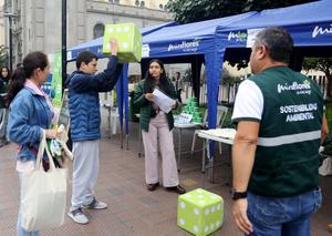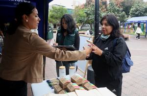 (250516) -- LIMA, 16 mayo, 2025 (Xinhua) -- Una trabajadora entrega productos a una mujer a cambio de material reciclado...