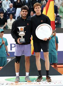 (250519) -- ROMA, 19 mayo, 2025 (Xinhua) -- Imagen del 18 de mayo de 2025 de Carlos Alcaraz (i), de...