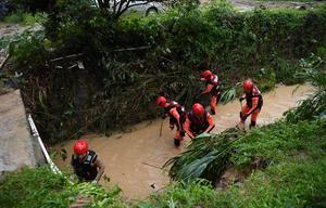 (250519) -- GAOZHOU, 19 mayo, 2025 (Xinhua) -- Rescatistas buscan víctimas en un arroyo cerca del sitio de un deslizamiento...