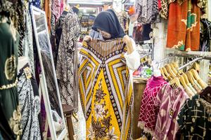 (250519) -- YAKARTA, 19 mayo, 2025 (Xinhua) -- Imagen del 18 de mayo de 2025 de un cliente seleccionando telas...