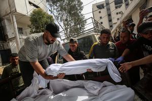 (250519) -- GAZA, 19 mayo, 2025 (Xinhua) -- Imagen del 18 de mayo de 2025 de palestinos trasladando cuerpos de...