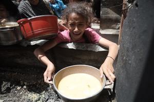 (250519) -- GAZA, 19 mayo, 2025 (Xinhua) -- Una niña palestina recibe alimentos gratuitos en un centro de distribución de...