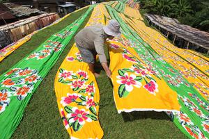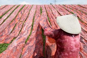 (250519) -- YAKARTA, 19 mayo, 2025 (Xinhua) -- Imagen del 17 de mayo de 2025 de un trabajador secando tela...