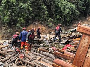 (250523) -- GUILIN, 23 mayo, 2025 (Xinhua) -- Rescatistas trabajan en el sitio de un deslizamiento de tierra, en el...