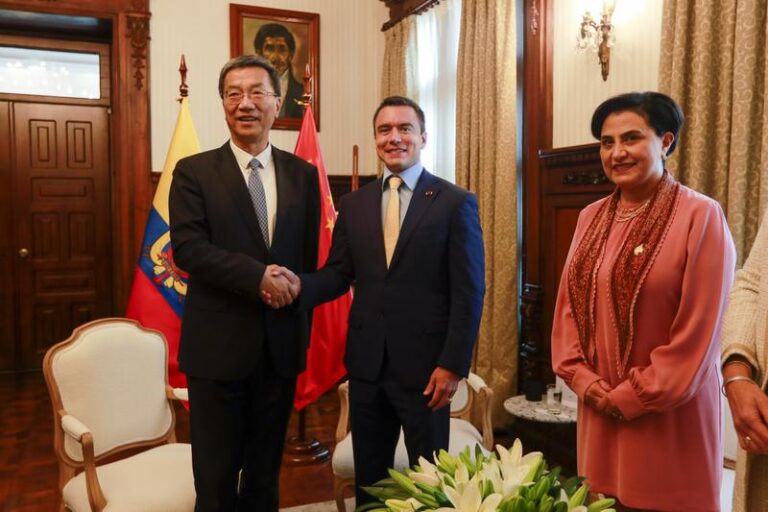 (250525) -- QUITO, 25 mayo, 2025 (Xinhua) -- El presidente ecuatoriano, Daniel Noboa, se reúne con Huai Jinpeng, enviado especial...