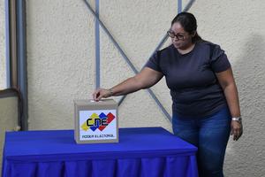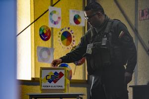 (250525) -- CARACAS, 25 mayo, 2025 (Xinhua) -- Un miembro de la Fuerza Armada Nacional Bolivariana emite su voto durante...
