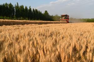 (250525) -- BEIJING, 25 mayo, 2025 (Xinhua) -- Una segadora cosecha trigo en los campos, en la aldea de Huzi...