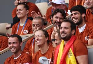 (250526) -- PARIS, 26 mayo, 2025 (Xinhua) -- Carlos Alcaraz (d-arriba), Iga Swiatek (c-frente) y Juan Carlos Ferrero (2-d-arriba), asistiendo...