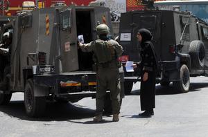 (250527) -- HEBRÓN, 27 mayo, 2025 (Xinhua) -- Un miembro de las fuerzas israelíes revisa los documentos de una mujer...