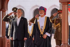 (250527) -- MASCATE, 27 mayo, 2025 (Xinhua) -- El sultán de Omán, Haitham bin Tariq Al Said (d-frente), da la...