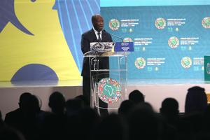 (250528) -- ABIYAN, 28 mayo, 2025 (Xinhua) -- Imagen del 27 de mayo de 2025 del presidente marfileño, Alassane Ouattara, hablando en la ceremonia de inauguración de las 60 Reuniones Anuales del Banco Africano de Desarrollo (BAfD), en Abiyán, Cote d'Ivoire. Las 60 Reuniones Anuales del BAfD fueron inauguradas el martes en la capital económica de Cote d'Ivoire, atrayendo a más de 5.000 asistentes, incluidos jefes de Estado y de gobierno, ministros de finanzas, gobernadores de bancos centrales, líderes empresariales, académicos y representantes de grupos de expertos de toda Africa. (Xinhua/Yvan Sonh) (jg) (da) (ce)