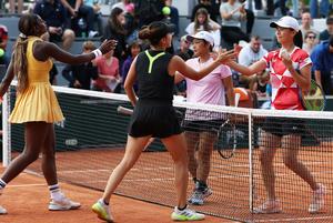 (250528) -- PARIS, 28 mayo, 2025 (Xinhua) -- Camila Osorio (2-i)/Alycia Parks (i) saludan a Jiang Xinyu (2-d)/Wu Fang-Hsien al término del partido de primera ronda de dobles femeninos entre Jiang Xinyu (China)/Wu Fang-Hsien (Taipei de China) y Camila Osorio (Colombia)/Alycia Parks (Estados Unidos), en el torneo de tenis Abierto de Francia, en Roland Garros, en París, Francia, el 28 de mayo de 2025. (Xinhua/Gao Jing) (ah) (ra) (ce)