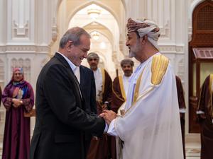 (250528) -- MASCATE, 28 mayo, 2025 (Xinhua) -- El sultán de Omán, Haitham bin Tariq Al Said (d), estrecha la mano del presidente iraní, Masoud Pezeshkian, en Mascate, Omán, el 28 de mayo de 2025. (Xinhua/Ministerio de Información de Omán) (ah) (ra) (ce)