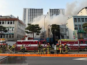 (250528) -- SEUL, 28 mayo, 2025 (Xinhua) -- Imagen tomada con un teléfono móvil de bomberos trabajando en el sitio de un incendio, en Seúl, República de Corea, el 28 de mayo de 2025. Un incendio se produjo el miércoles en un antiguo edificio comercial en Seúl, capital de República de Corea, de acuerdo con diversos medios de comunicación. (Xinhua/Huang Xinxin) (jg) (da) (ce)