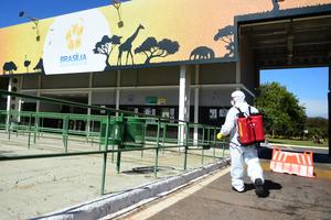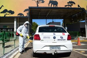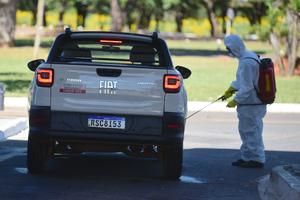 (250529) -- BRASILIA, 29 mayo, 2025 (Xinhua) -- Un trabajador de la salud desinfecta un vehículo dentro de una barrera...