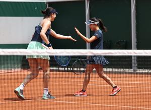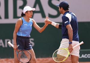 (250529) -- PARIS, 29 mayo, 2025 (Xinhua) -- Ninomiya Makoto (d)/Tang Qianhui festejan un punto durante el partido de primera...