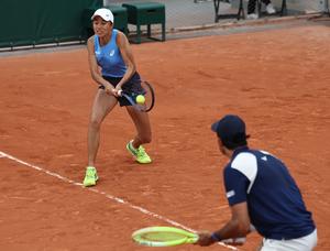 (250529) -- PARIS, 29 mayo, 2025 (Xinhua) -- Ninomiya Makoto/Tang Qianhui (d) compiten durante el partido de primera ronda de...