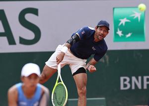 (250529) -- PARIS, 29 mayo, 2025 (Xinhua) -- Zhang Shuai (i)/Marcelo Arevalo festejan durante el partido de primera ronda de...