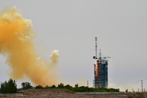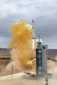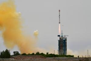 (250529) -- JIUQUAN, 29 mayo, 2025 (Xinhua) -- Un cohete portador Gran Marcha-4B transportando un nuevo satélite, Shijian-26, despega desde...