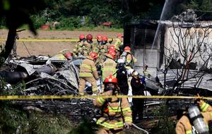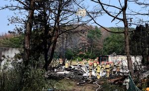 (250529) -- POHANG, 29 mayo, 2025 (Xinhua) -- Rescatistas trabajan en el sitio de un accidente aéreo del avión militar,...