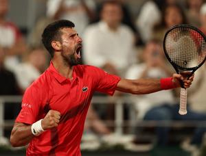 (250601) -- PARÍS, 1 junio, 2025 (Xinhua) -- Imagen del 31 de mayo de 2025 de Novak Djokovic festejando un...