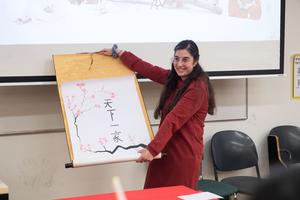 (250529) -- JERUSALEN, 29 mayo, 2025 (Xinhua) -- Una participante muestra caligrafía durante el 24 concurso de dominio del idioma...
